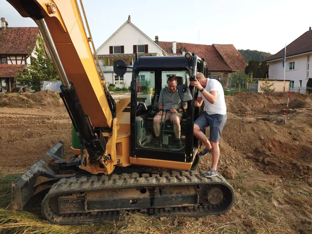 Nachdem der symbolische Spatenstich vollbracht war, folgte der „Moderne Spatenstich“ mit einem beeindruckenden Bagger. Die Bauherrenfamilie hatte die Gelegenheit, den Spaß daran zu erleben, in Sekundenschnelle mehrere Hundert Kilogramm Erdmasse zu bewegen. Die strahlenden Gesichter und das herzliche Lachen zeugten von der Freude, die dieser besondere Moment mit sich brachte. Es war ein Zeichen dafür, dass der Bau ihres neuen Schwedenhauses nicht nur ein bedeutendes Ereignis in ihrem Leben darstellt, sondern auch ein unvergessliches Abenteuer, das sie gemeinsam meistern wollen.
